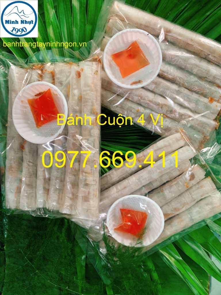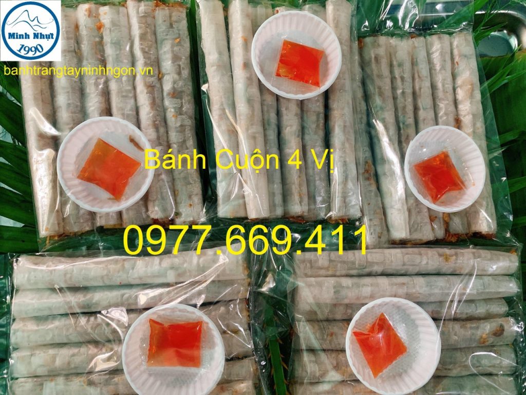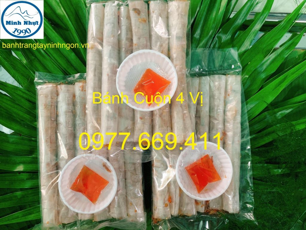 Bánh tráng cuốn 4 vị Minh Nhựt là sản phẩm độc đáo bởi bốn hương vị đặc trưng của bánh tráng, đậu phộng, con ruốc và hành lá được pha trộn với tỷ lệ hoàn hảo dưới bàn tay của những người thợ Tây Ninh.