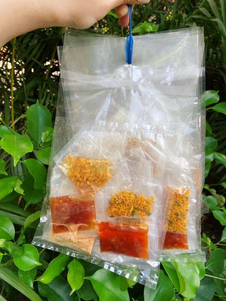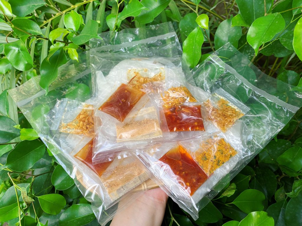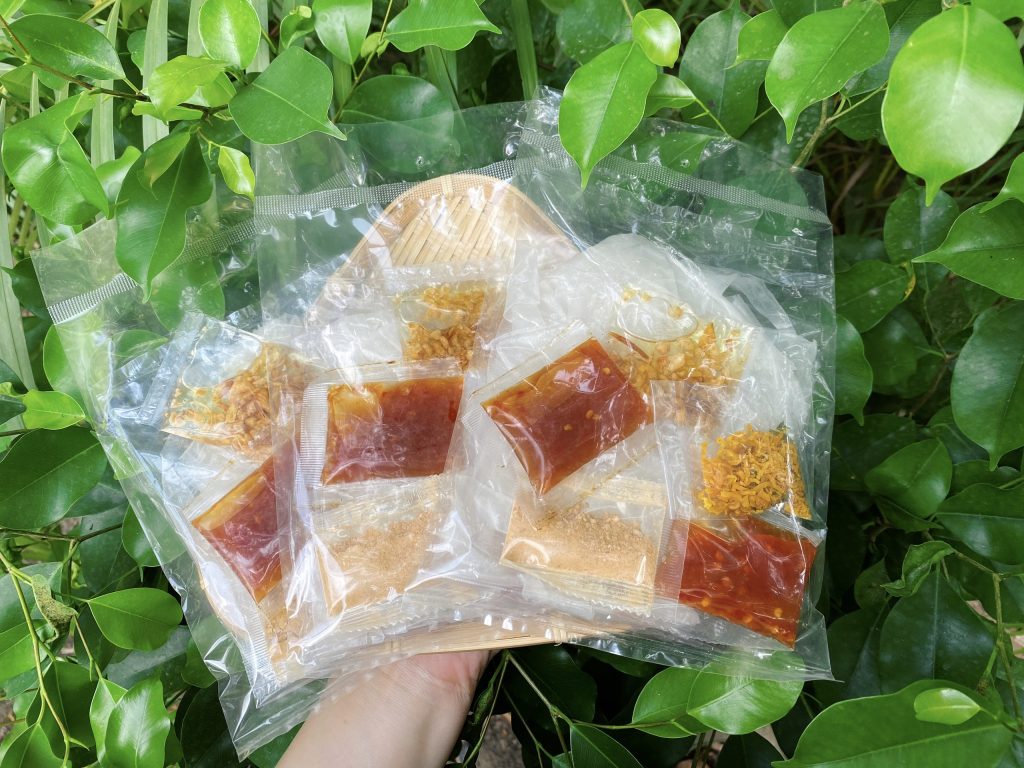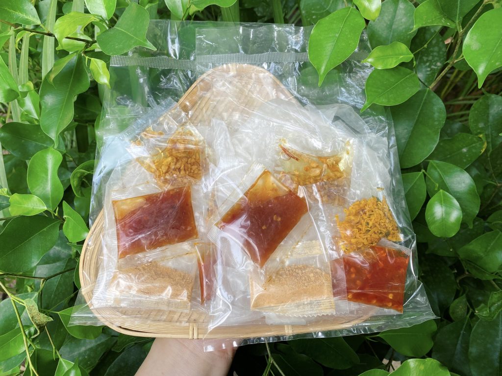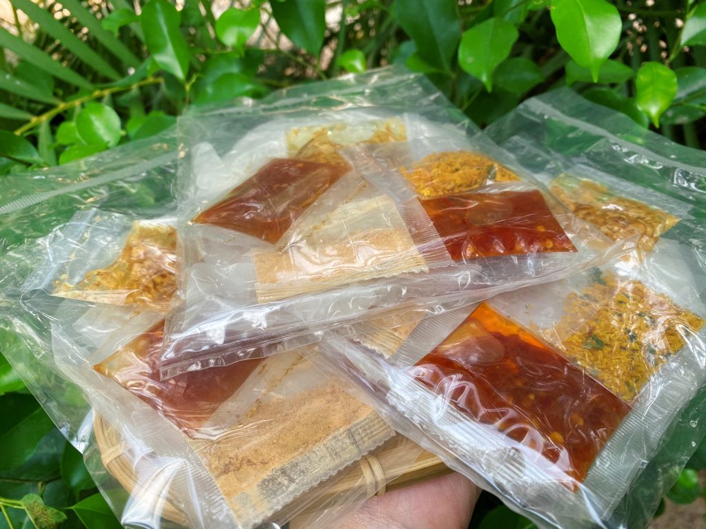 Thành phần: bánh tráng gốc phơi sương, dầu tỏi, khô gà nát, dầu ớt, muối tôm nhuyễn loại 1
