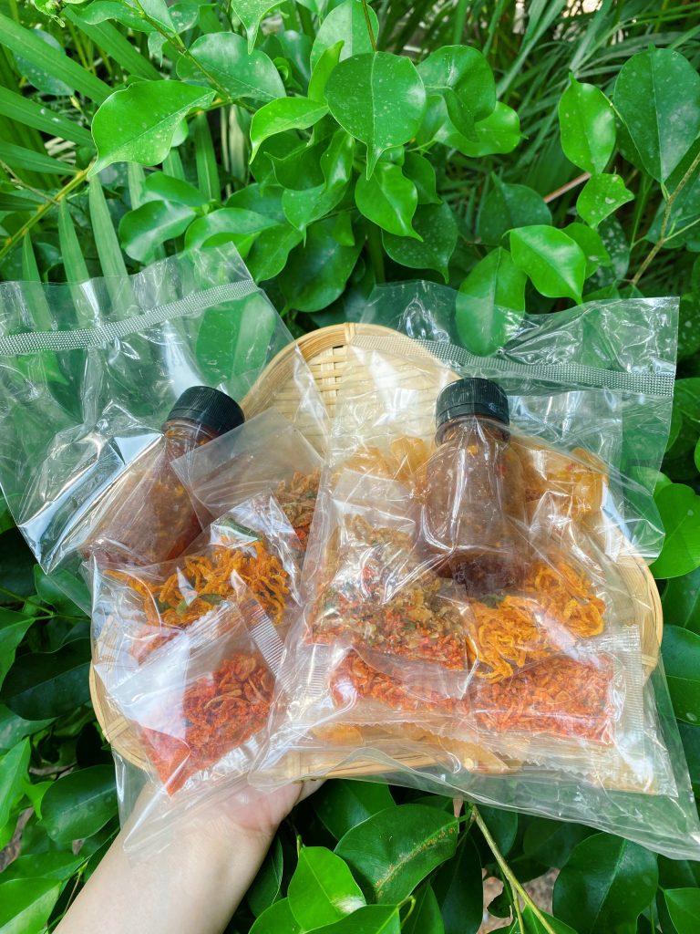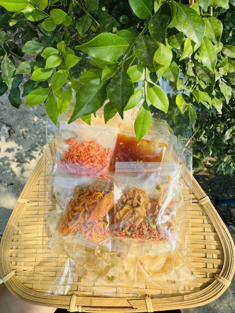 ● Thành phần:Bánh tráng dẻo cay cắt sợi, khô gà to, sốt tắc, ruốc sấy, muối hành phi